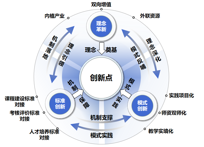 突破传统职业教育“院校办学、企业用人”的单向合作理念,提出“内植产业赋能、外联资源转化”的双向育人理念:“内植”聚焦将企业实体、生产场景、管理规范植入校内. . .