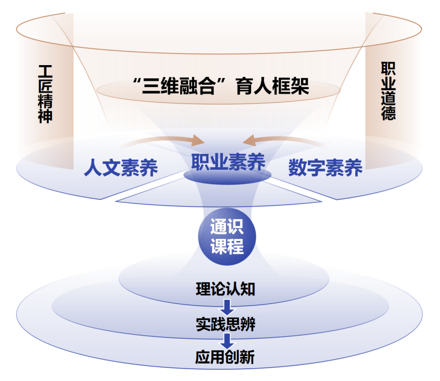 提出“职业素养+人文素养+数字素养”融合目标,构建“理论认知—实践思辨—应用创新”三阶培养路径,打破技能与素质培育分离的固有模式。以工匠精神、职业道德等职业核心素养为价值导向,将通识教育有机融入人才培养全过程,推动职业性与通识性在目标、内容与场景上的统一与融合。面向人工智能时代,创新设计“数字素养赋能”实施路径,通过数字技术革新通识教育方式,彰显现代职业教育类型特色。