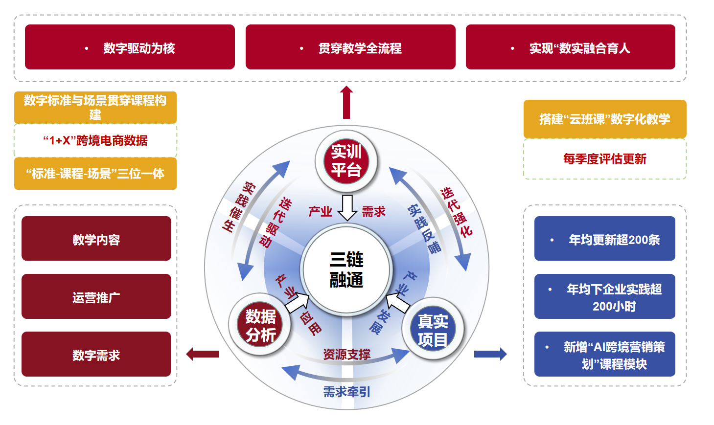 传统教学资源以“学科知识体系、通用教学目标”为供给导向,过度依赖广谱化教材与基础实训资源,未结合跨境电商运营、推广、货代等不同岗位的数字需求差异,导致人才培养目标未精准对标产业数字规格,教学资源与产业实际数字场景脱节,削弱学生知识应用效率,束缚岗位适配性数字技能提升。