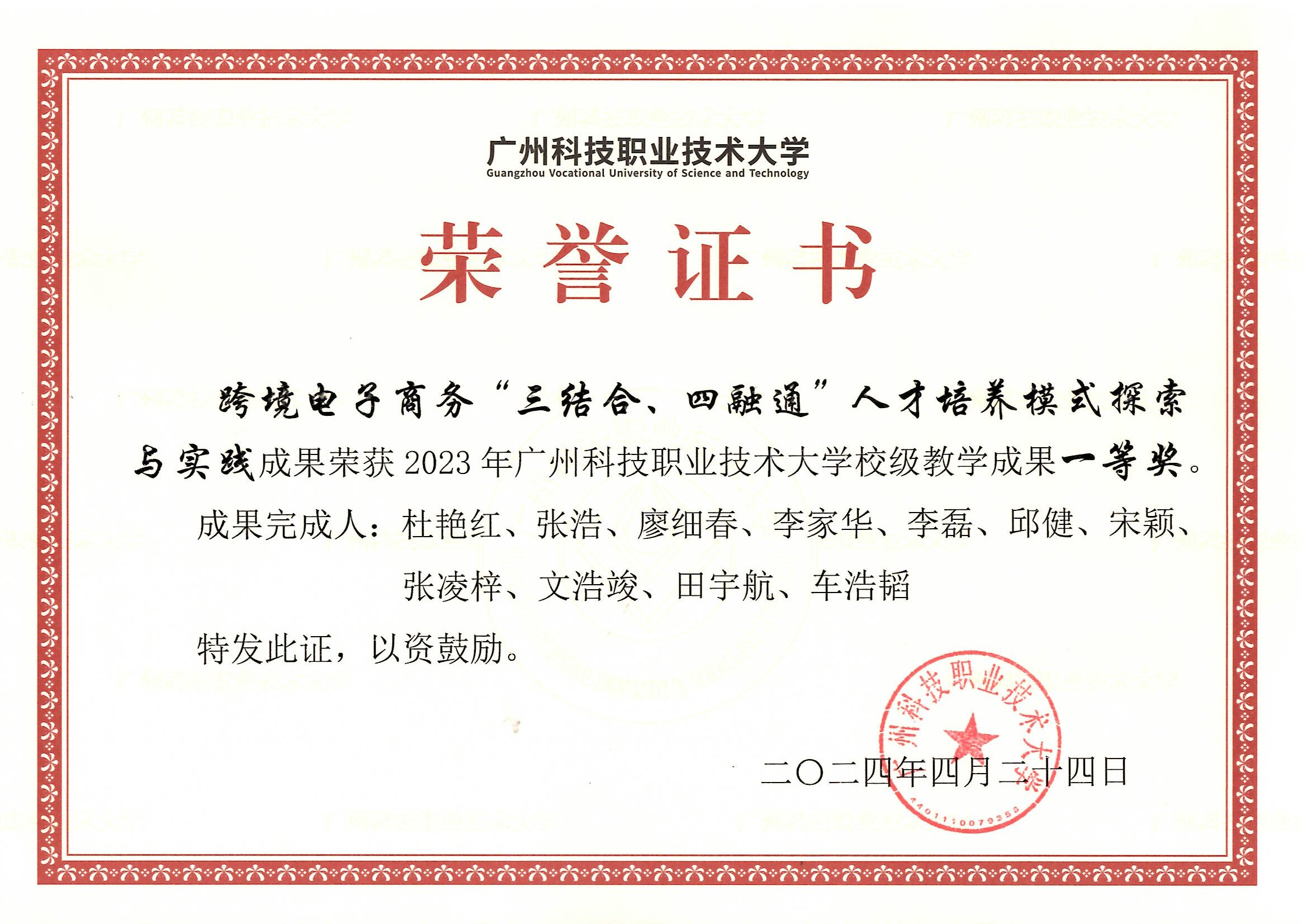 (1)竞赛获奖成果丰硕,学生在跨境电商及相关领域竞赛中屡获高阶奖项,先后斩获全国大学生跨境电商创新创业大赛(国家级一等奖)、全国大学生数字创新能力大赛(国家级一等奖)、全国大学生英语翻译大赛(国家级一等奖)、广东省职业院校技能大赛英语口语大赛(省赛一等奖)、“外教社Ÿ词达人杯”全国大学生英语词汇能力大赛(省赛二等奖)、一带一路暨金砖国家技能发展与技术创新大赛(国赛二等奖)、全球. . .