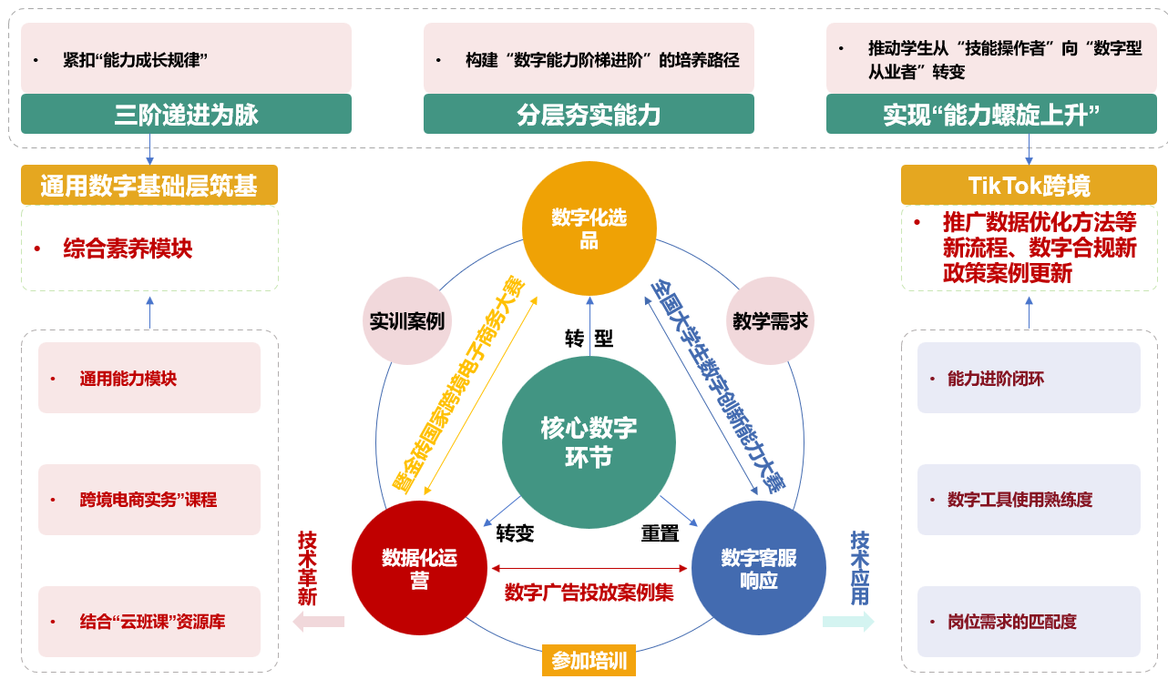 党的二十大报告首次将“推进教育数字化”写入党代会报告,为职业教育数字化转型提供根本遵循。作为粤港澳大湾区跨境电商数字化育人先行者,学校依托阿里巴巴跨境电商人才培育基地、阿里巴巴国际站数字贸易人才基地及2项省级项目,聚焦产业数字需求与教学适配不足、课程迭代滞后于跨境电商技术发展、技能型人才供给与企业紧缺需求脱节三大核心痛点,沿“数字化载体搭建→数字能力阶梯培养→数智化协同育人”路径深耕多年,创新构建起“数字驱动・三阶递进・四径协同”的跨境电商人才培养体系,形成覆盖“底座搭建-路径设计-体系落地”的完整育人框架(见图 1),实现教育链、人才链与产业数字链的深度融合,有效破解人才培养与产业发展脱节难题,为区域跨境电商产业数字化转型提供高端技能人才支持。