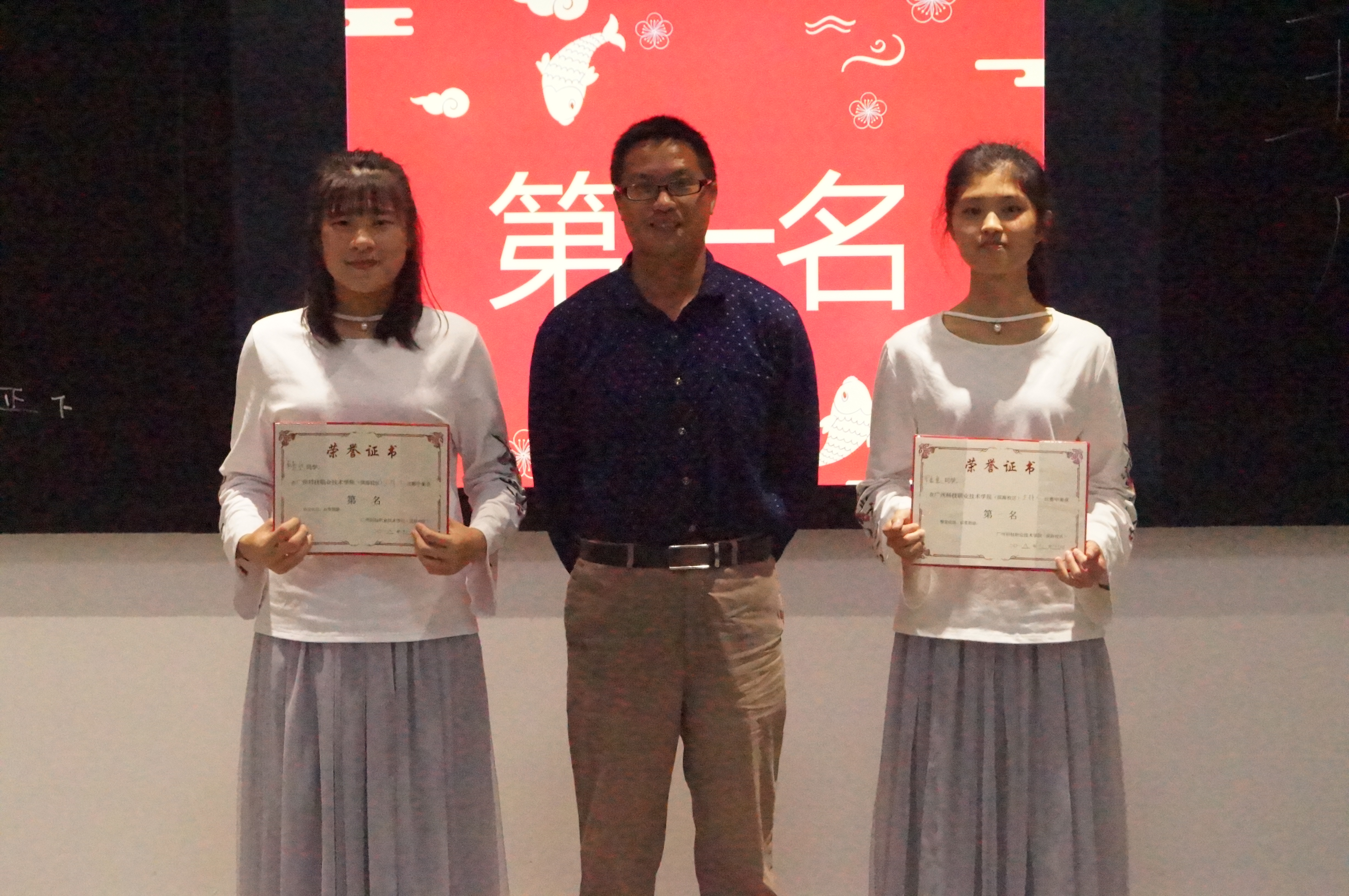 图一,曾庆荣副主任(中)与一等奖获得者袁嘉欣、罗嘉惠