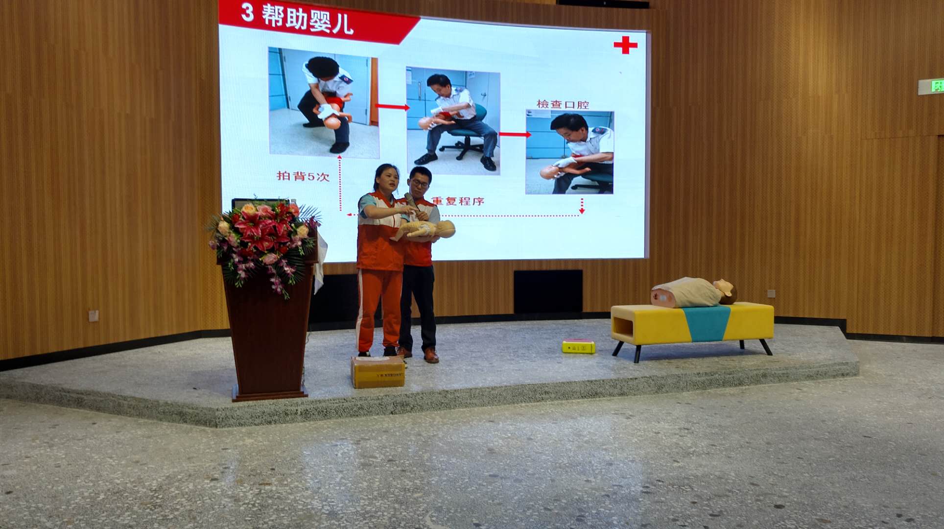 高波和肖少容医生互相配合,对心搏骤停患者模型施展了现场急救示范。肖少容医生指出,对心搏骤停患者,4分钟内是急救的黄金时期,如患者得不到即刻抢救复苏,会造成患者脑和其他人体重要器官组织的不可逆损害。施救步骤先后为,第一步拍双肩和呼叫患者,并用手指感应颈部脉搏;第二步呼救和请人协助,将病人平躺,解开衣扣;第三部实施胸外按压,开放气道和进行人工呼吸,每按压30次实施2次人工呼吸,直至病人恢复自主呼吸和心跳。