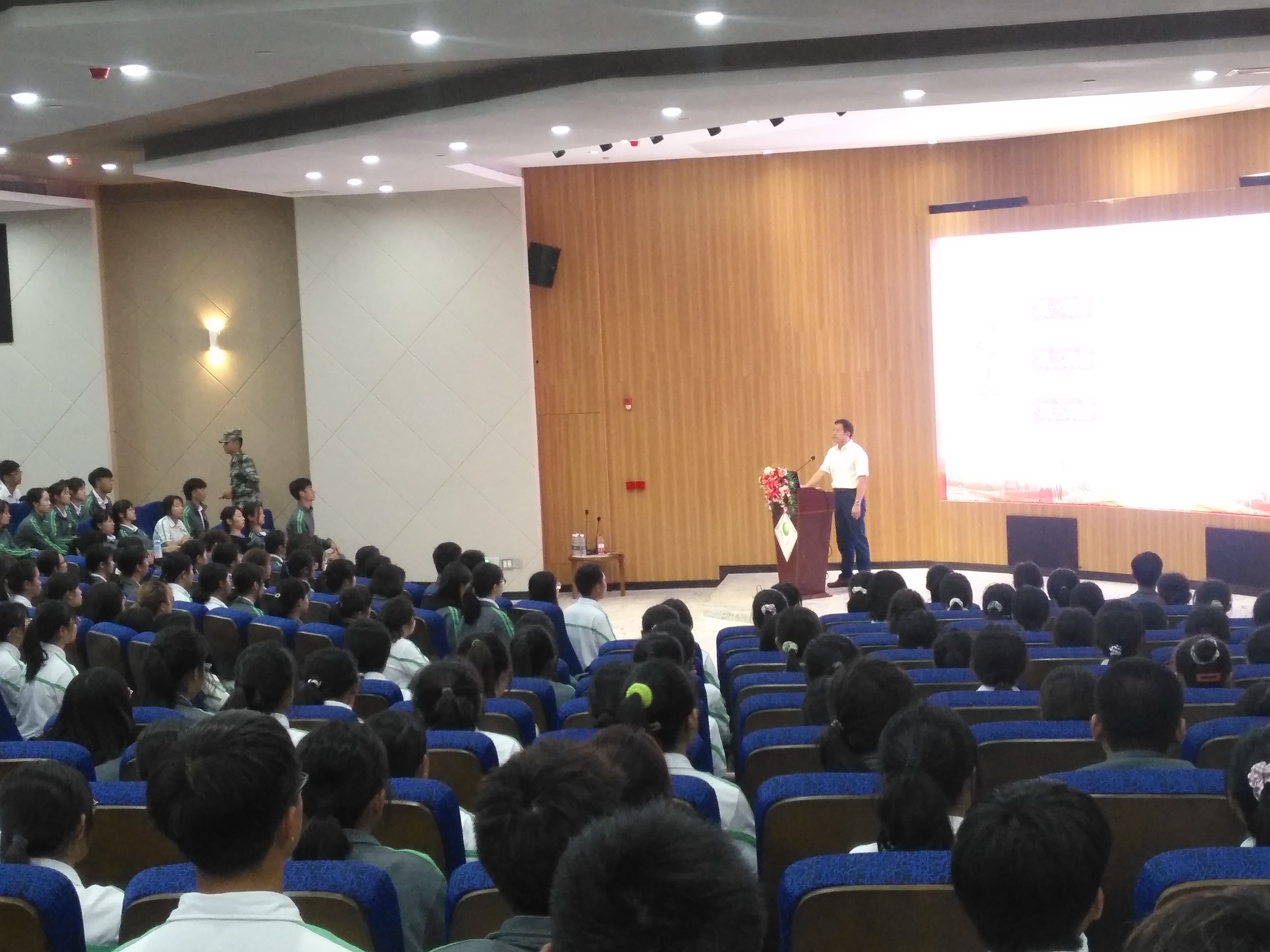 10月21日上午,滨海校区500名师生在行政楼报告厅济济一堂,学校党委副书记吴戴同志正在给她们上入学以来的第一堂思政公开课。