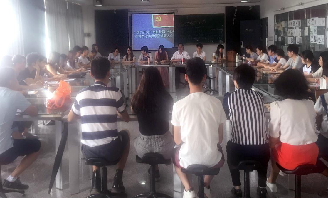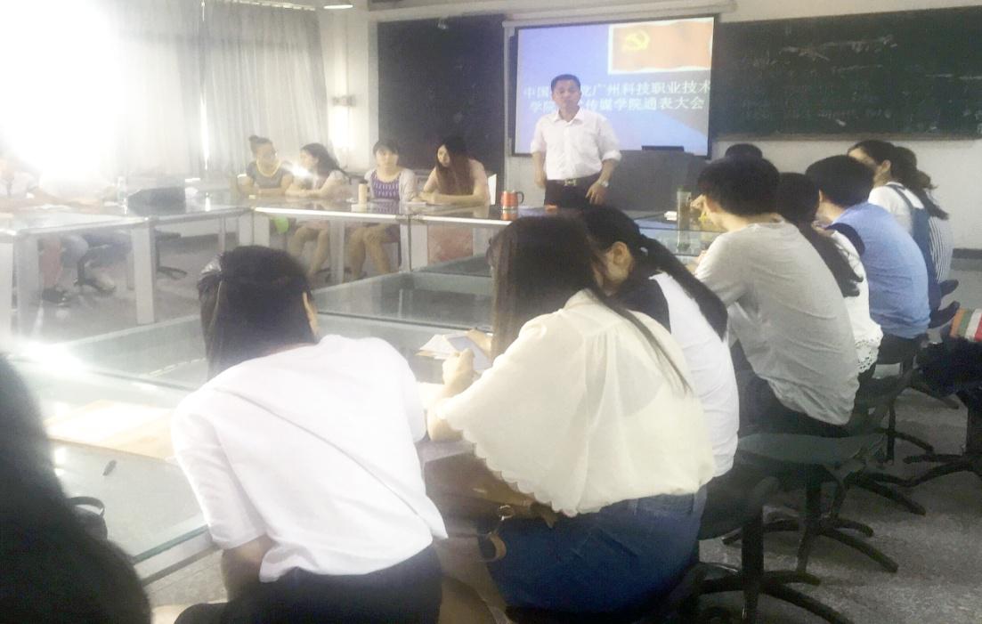中国共产党广州科技职业技术学院艺术传媒学院通表大会于2016年5月25日下午2:30在7602教室顺利召开。参加本次大会的有副院长陈华同志、党支部书记黄觉结同志及各教工党员、学生党员、15名入党积极分子和11名预备党员。