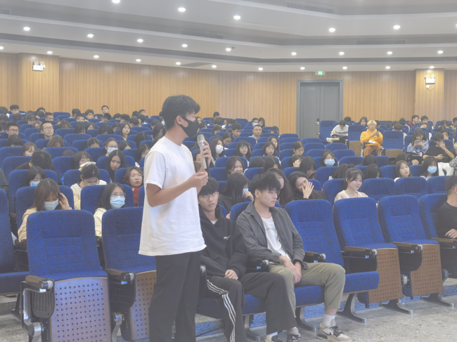 为拉进与同学们的心理距离,刘普云老师自称自己为“刘老同学”。对如何扣好人生的第一粒扣子,他给同学们分享了贪得无厌的老财主和诚实劳动的小伙子在面对万能小泥人时的不同态度,获取数量不同的物资财富,而导致不同的人生结果。诚实劳动的小伙子用知足的心态而获得良好的结局,贪婪的财主由于无尽的欲望而最终一无所得,指出依靠自身实实在在的劳动去获取劳动果实是成就快乐和充实的人生前提。幸福人生不要过多地依赖走捷径。对大学生如何扣好人生的每一粒扣子,刘老师认为必须学会学习、全面发展,提高自己的判断力和正确选择的能力,既把握现在又立足长远,才能扣好人生的每一粒扣子。谈到如何看待错误、每个人在自己的人生中有多少个角色、如何发现处理扣错的扣子等问题时,刘普云老师挑选了三组同学展开现场辩论。同学们在讲座现场各述其词,从不同角度分享他们看待错误问题的视角和观点,许多未被挑选到发言的同学们也积极主动地参与了讨论,现场气氛热烈,大家受益匪浅。