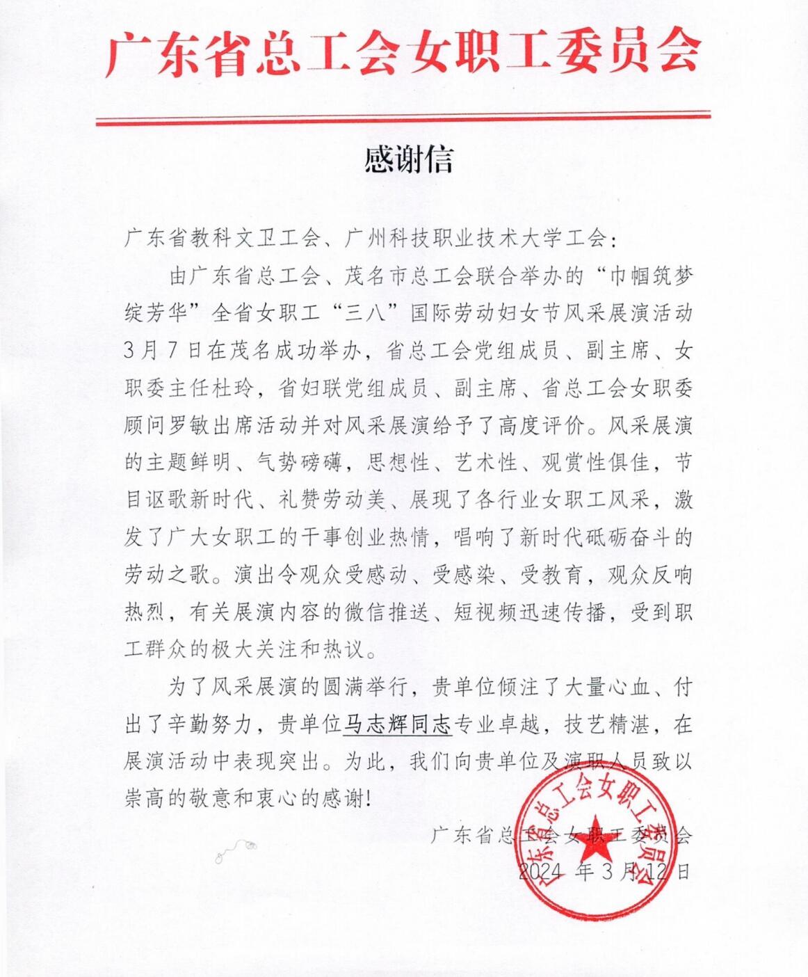 学校工会副主席、艺术团团长马志辉老师带领工会及艺术团成员代表广东省教科文卫工会、乐鱼手机平台_乐鱼(中国)工会前往茂名赴会参加此次“巾帼筑梦绽芳华”广东省女职工“三八”国际劳动妇女节风采展演活动。