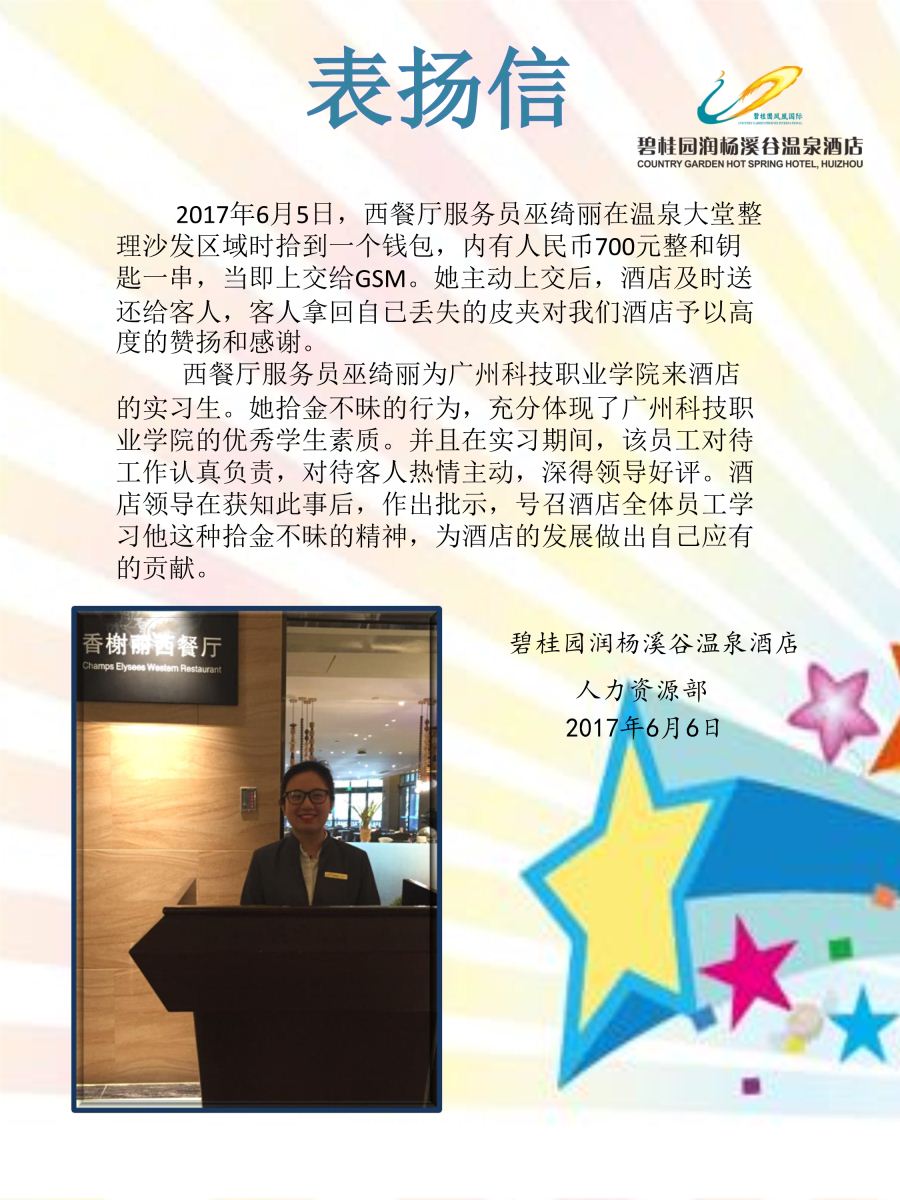 近日,碧桂园润扬溪谷温泉酒店给我院发来表扬信。6月5日,2015级酒店管理专业一班学生巫绮丽在碧桂园润扬溪谷温泉酒店实习期间,在温泉大堂整理沙发区域时拾到一个钱包,内有人民币700元整和钥匙一串,当即上交给GSM。她主动上交后,酒店及时送还给客人,客人拿回自已丢失的皮夹对酒店和学院予以高度的赞扬和感谢。