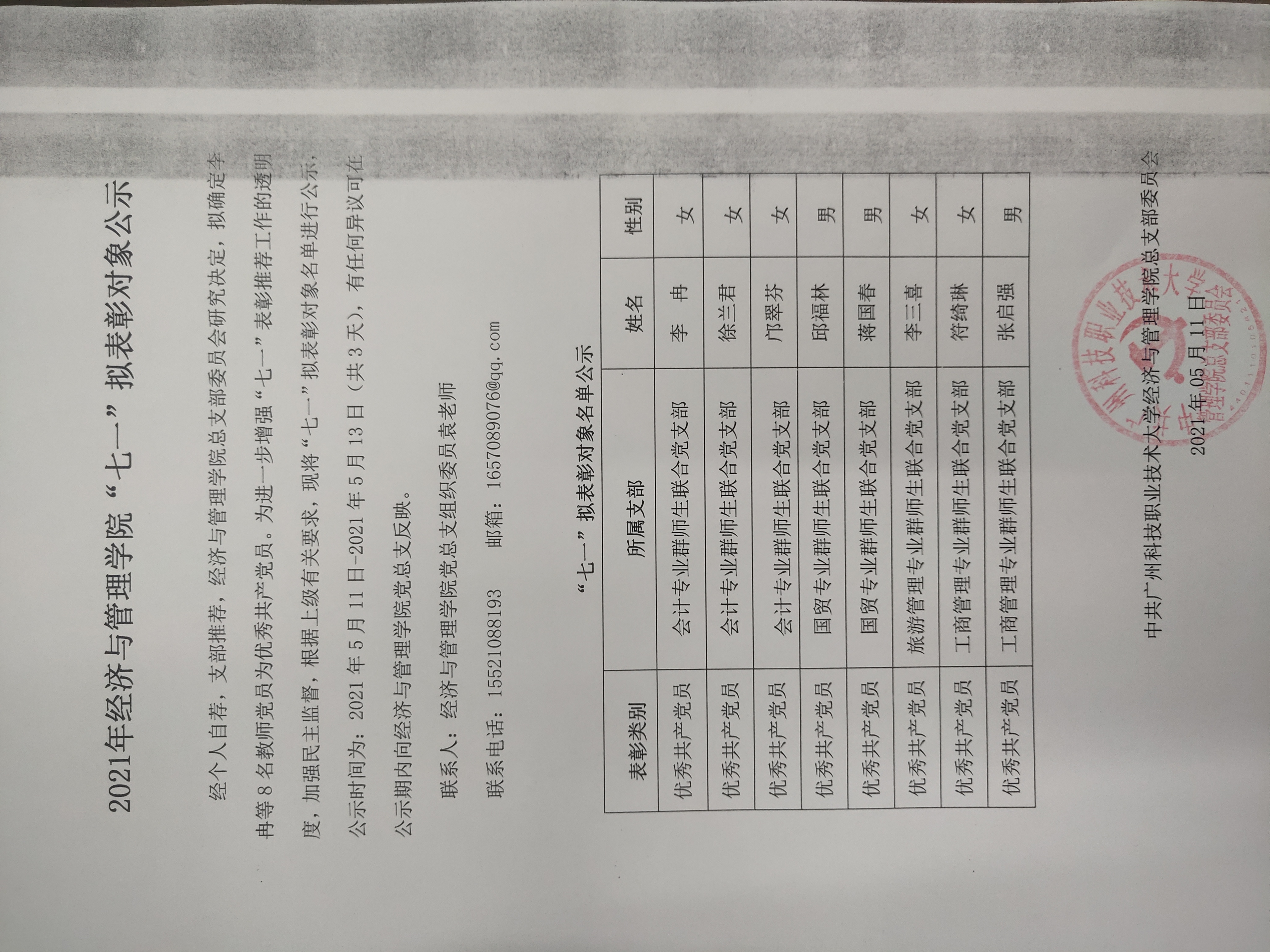 经个人自荐,支部推荐,经济与管理学院总支部委员会研究决定,拟确定李冉等8名教师党员为优秀共产党员。为进一步增强“七一”表彰推荐工作的透明度,加强民主监督,根据上级有关要求,现将“七一”拟表彰对象名单进行公示,公示时间为:2021年5月11日-2021年5月13日(共3天),有任何异议可在公示期内向经济与管理学院党总支反映。