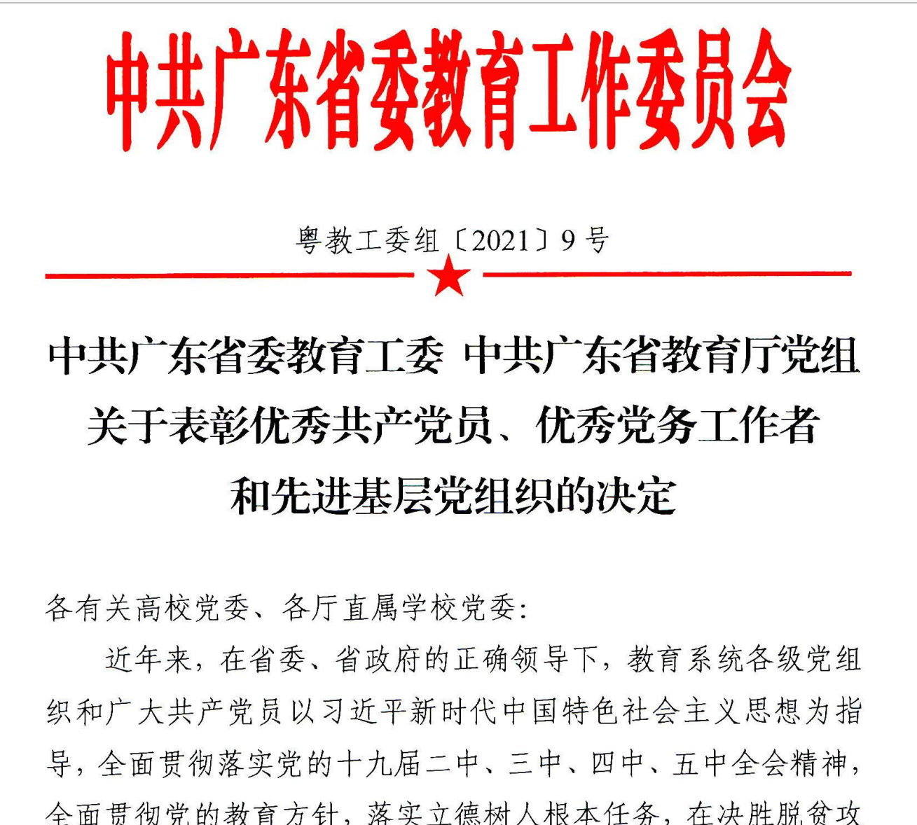 在庆祝中国共产党成立100周年之际,为表彰先进、弘扬正气,树立标杆,中共广东省委教育工委、中共广东省教育厅党组做出决定,表彰我省教育系统优秀共产党员、优秀党务工作者和先进基层党组织。经济与管理学院党总支刘静书记(兼任副院长)被中共广东省委教育工委、中共广东省教育厅党组授予“优秀党务工作者”称号。