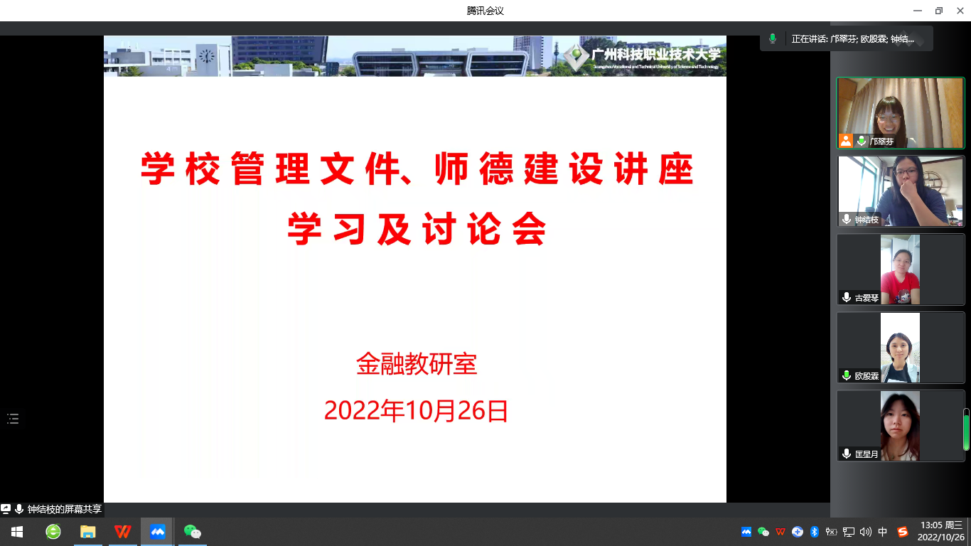 10月26日下午,经济与管理学院金融教研室举行学校管理文件、师德建设讲座学习及讨论会,金融教研室广州校区的全体老师参加,会议由金融专业主任邝翠芬老师主持,采取腾讯会议的形式进行。