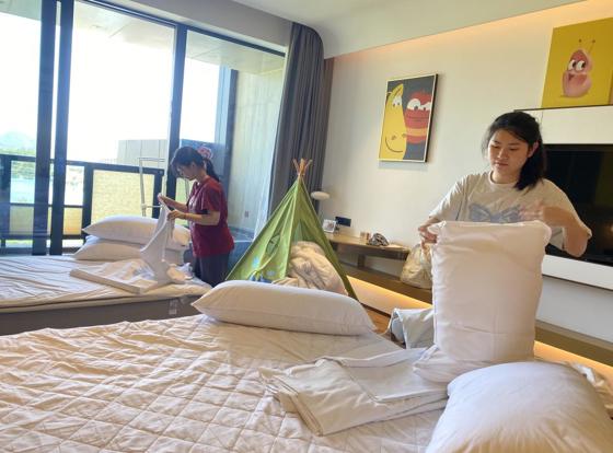 甘雪仪紧扣母亲节主题,在洁白床旗上布置康乃馨图案,床边以 “爱心小兔” 造型传递温暖,将对母亲的感恩之情与 “家国同构” 的文化内涵巧妙结合,既营造了节日氛围,又赋予客房布置更深层的情感价值。