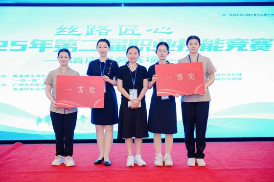 2025 年 4 月 23 日至 24 日,第二届 “丝路匠心” 职业技能大赛(酒店服务赛项)在增城太阳城大酒店圆满收官。乐鱼手机平台_乐鱼(中国)酒店管理专业两支参赛队伍在黎翔副院长的统筹指导下,由教研室张鹏主任和涂艳老师带队,凭借精湛的专业技能与创新设计,双双斩获一等奖,展现了职业教育产教融合的卓越成效。