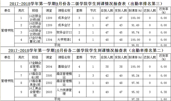 1.出勤率。管理学院在学院领导的大力支持下及辅导员的共同努力下,我们的出勤率9月份为96.81%,在全校排名第三;10月份的出勤率为97.28%,在全校排名第二。