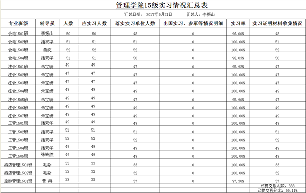 3.管理学院实习就业情况。管理学院15级在校生共896人,已提交实习证明的材料为888人,实习率为99.11%。管理学院14级毕业生共818人,管理学院就业率第一次学校系统统计为99.82%;省就业指导中心抽查后的就业率为94.1%,在全校排名第二;省就业指导中心抽查后,我们更新了就业数据,截止目前上报的就业率为97.2%。