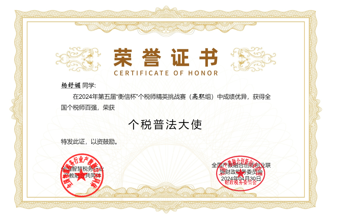 本次竞赛共分为本科组、高职组、中职组、社会组四个组别,通过线上网络形式进行参赛,奖项设置包括个人成绩与参赛团体总成绩。该竞赛一经发布,本专业老师就积极动员组织22级与23级大数据与财务管理、大数据与会计专业学生参加,最后有一百多名学生报名并参赛。经过10几天的线上竞赛答题,我院22级大数据与财务管理专业的杨舒媚同学在高职组中成绩优异,获得全国个税师百强,荣获“个税普法大使”称号。