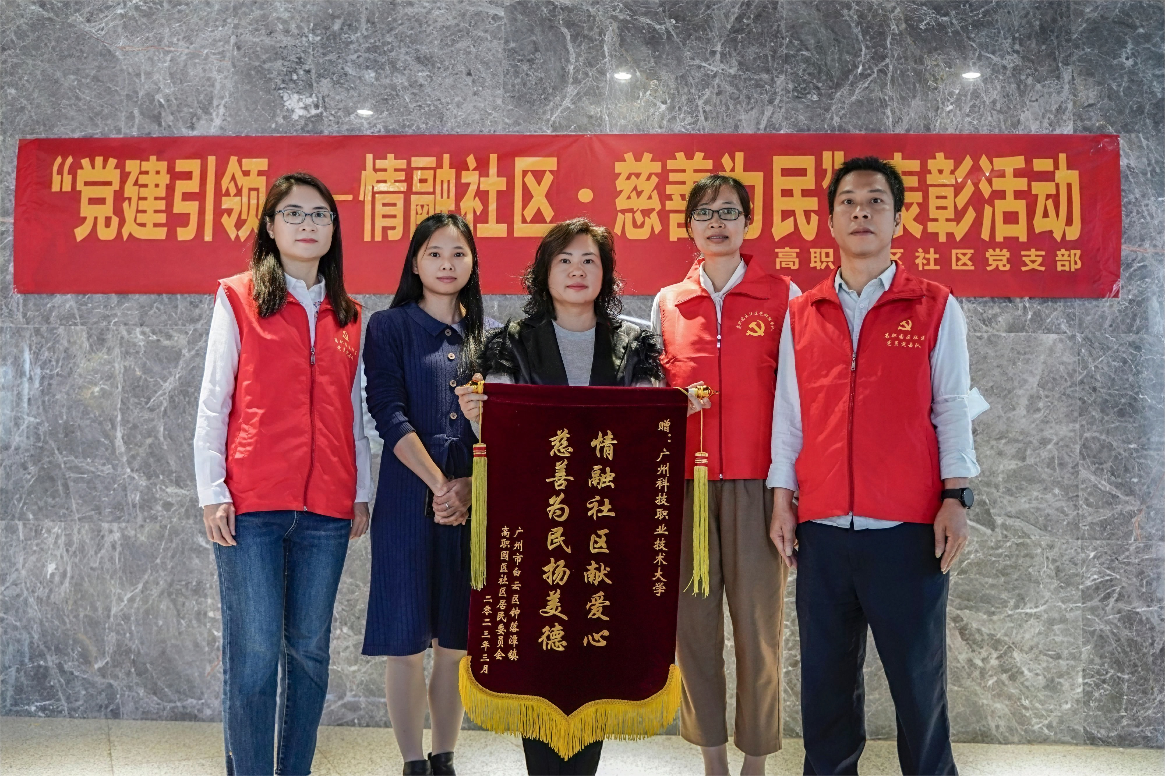 2023年3月20日,为感谢学校对社区慈善事业的支持,钟落潭高职园社区党支部书记冯晋碧同志带领社区“两委”干部、工作人员为我校送来了绣有“情融社区献爱心,慈善为民扬美德”的锦旗。