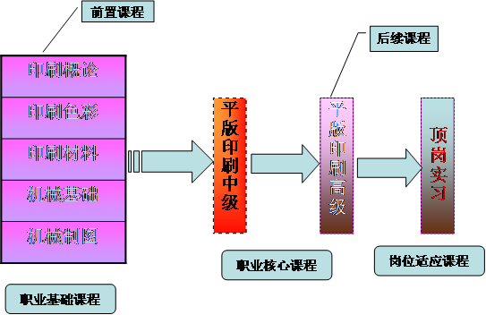 本课程是在学习《印刷概论》、《印刷色彩》、《印刷材料》、《机械基础》、《机械制图》的基础上所开设的一门专业核心课,后续课程为《平版印刷(高级)》。本课程与相关课程的关系如下: