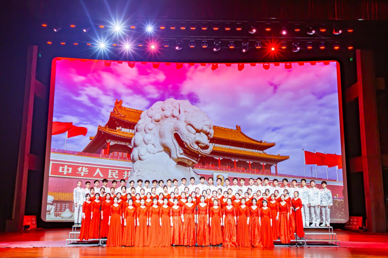 “我们宣誓,为共产主义事业奋斗终生”,校团委广播站带来朗诵《鲜红的党旗永不褪色》,鲜红的党旗,伴随着中国共产党走过了风风雨雨;在这峥嵘岁月里,党旗在中华大地上空熠熠生辉、高高飘扬。浩瀚的宇宙磅礴,由艺术团音乐队带来的歌曲演唱《光年之外》,仿佛新时代的青年人置身浩瀚星海,即便微小,仍然满怀希望,勇往直前。壮阔旋律饱含了赤子深情,杜威老师、胡蓉老师带来的歌曲演唱《长江之歌》唱出了新时代、新精神,唱出了“你用磅礴的力量推动新的时代”的真正内涵。长笛声悠扬,一曲优美的“芳草碧连天”,感动了一代又一代的中华儿女。长笛演奏邱雅文同学和时装表演艺术团模特队带来的 《送别》 ,情意真挚,让我们感悟到那个年代离别时不舍之情。超燃原创RAP《启》来袭,艺术团说唱队用舞台感染力和充满力量的说唱,让我们感受到了时代的气息和青春的活力,看今朝中华少年的风华正茂。一支充满记忆的《映山红》舞蹈,仿佛把我们带进了那段峥嵘岁月。艺术团古典舞队的姑娘们带来的扇子绸缎舞此起彼伏,大气磅礴,像映山红开滿了山坡,真美。艺术团合唱队带来的大合唱《爱我中华》、《我爱你中国》奏响爱国主旋律,充满情感的歌声点燃了所有人的爱国热情,全场师生自发高歌着,热泪盈眶,那是对幸福生活的喜悦和感恩,是对美好未来的憧憬和信心。