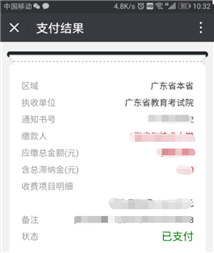 缴费完成时,“广东省自学考试管理系统”将提示支付结果信息。