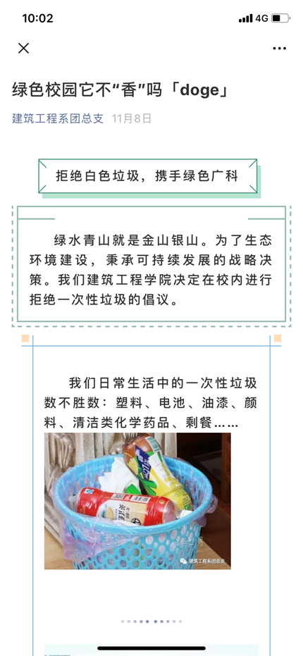 面对广大学生群体宣传垃圾分类知识的工作,建筑工程学院学生党支部书记温诗晴表示,会通过微信、主题班会等多种方式做好垃圾分类进校园知识的宣传,学生干部带头,推动广大学生形成垃圾分类的意识并落实到实际行动。