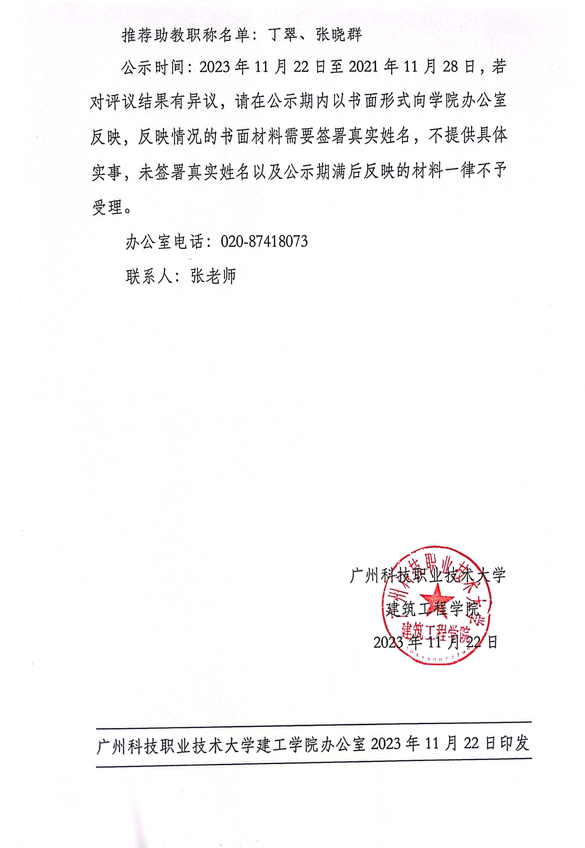 推荐助教职称名单:丁翠、张晓群