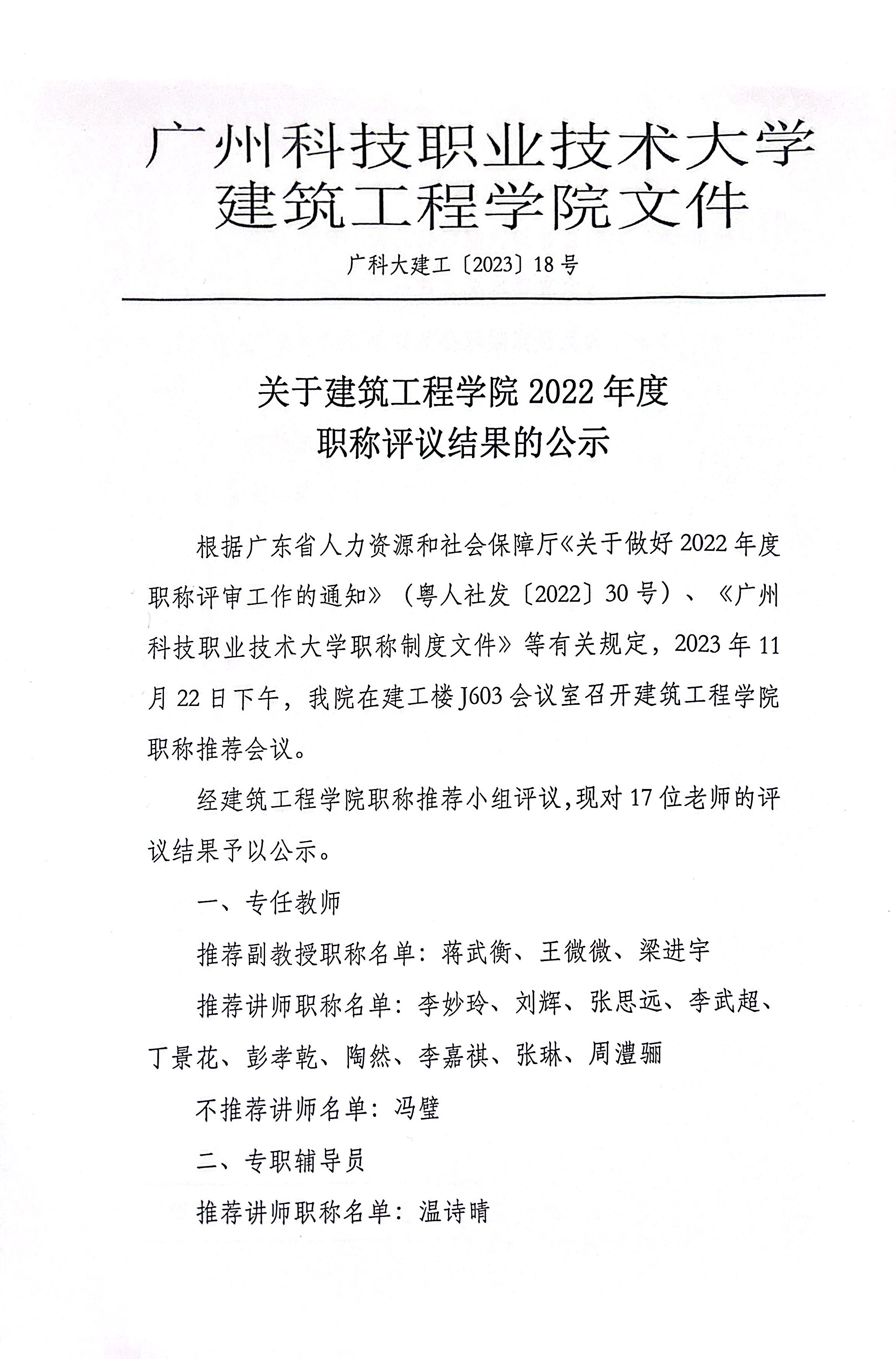 根据广东省人力资源和社会保障厅《关于做好2022年度职称评审工作的通知》(粤人社发〔2022〕30号)、《乐鱼手机平台_乐鱼(中国)职称制度文件》等有关规定,2023年11月22日下午,我院在建工楼J603会议室召开建筑工程学院职称推荐会议。
