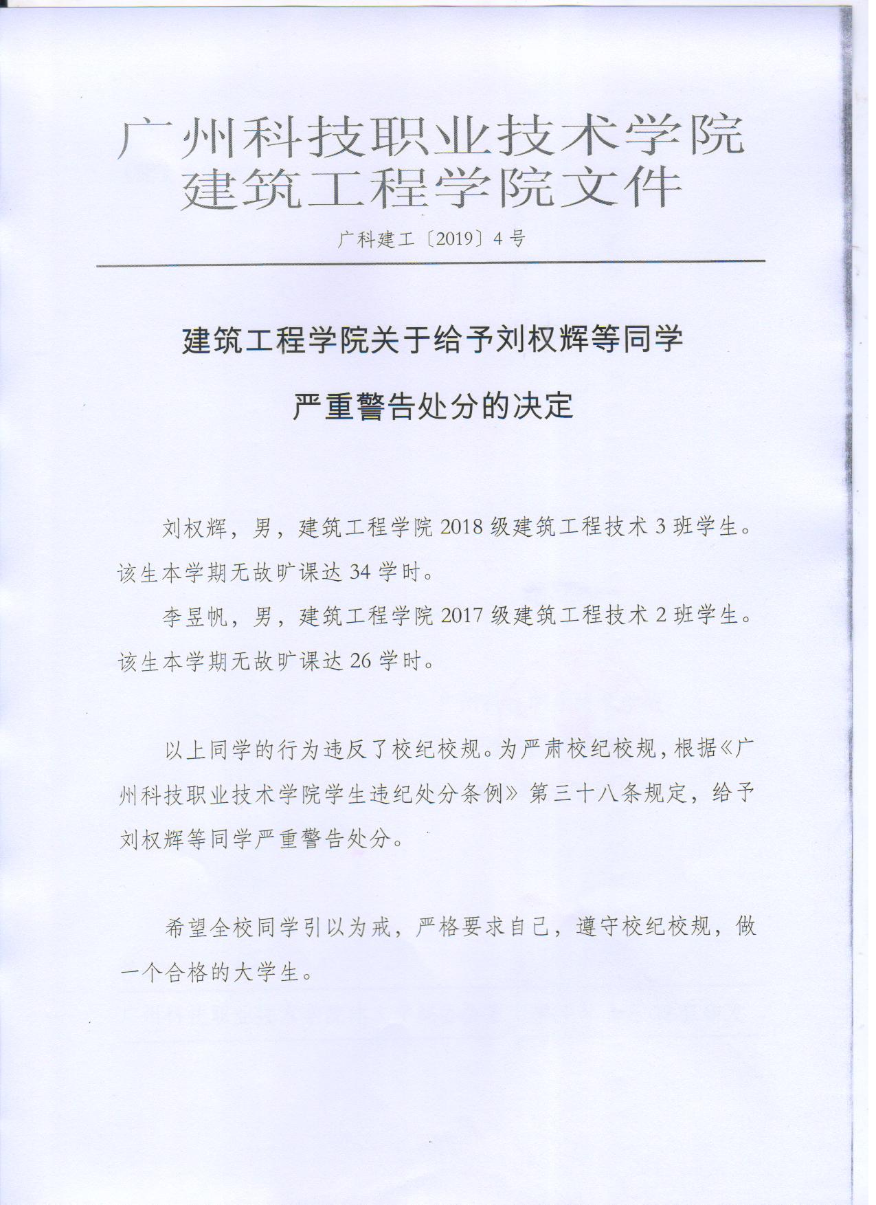 建筑工程学院关于给予刘权辉等同学严重警告处分的决定