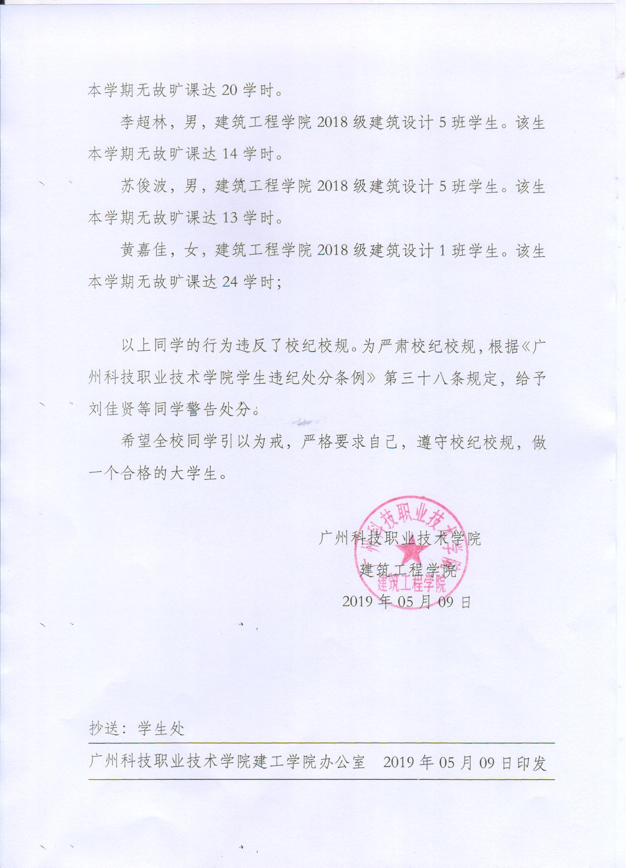 建筑工程学院关于给予刘佳贤等同学警告处分的决定