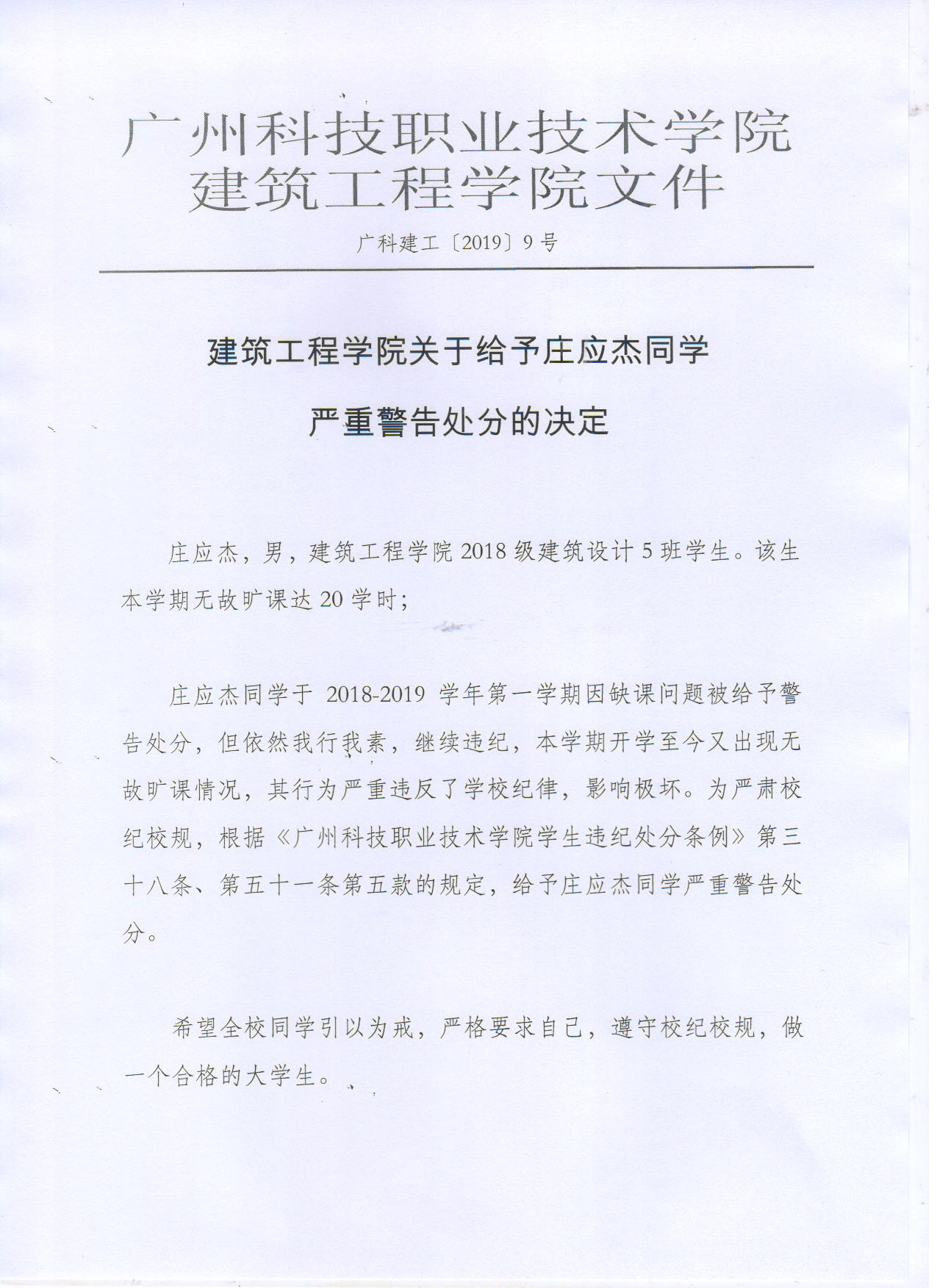 建筑工程学院关于给予庄应杰同学严重警告处分的决定