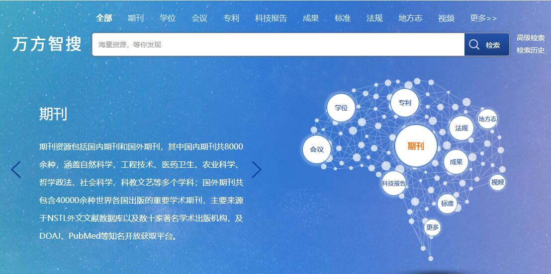 万方数据知识服务平台整合数亿条全球优质知识资源,集成期刊、学位、会议、科技报告、专利、标准、科技成果、法规、地方志、视频等十余种知识资源类型,覆盖自然科学、工程技术、医药卫生、农业科学、哲学政法、社会科学、科教文艺等全学科领域,实现海量学术文献统一发现及分析。