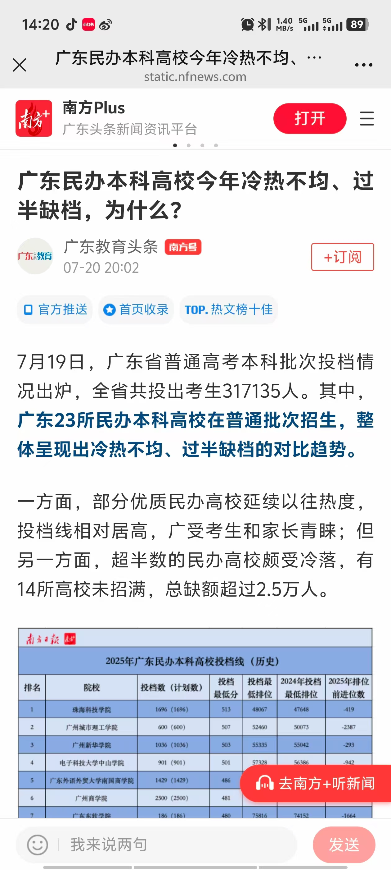 7月19日,广东省普通高考本科批次投档情况出炉,全省共投出考生317135人。其中,广东23所民办本科高校在普通批次招生,整体呈现出冷热不均、过半缺档的对比趋势。