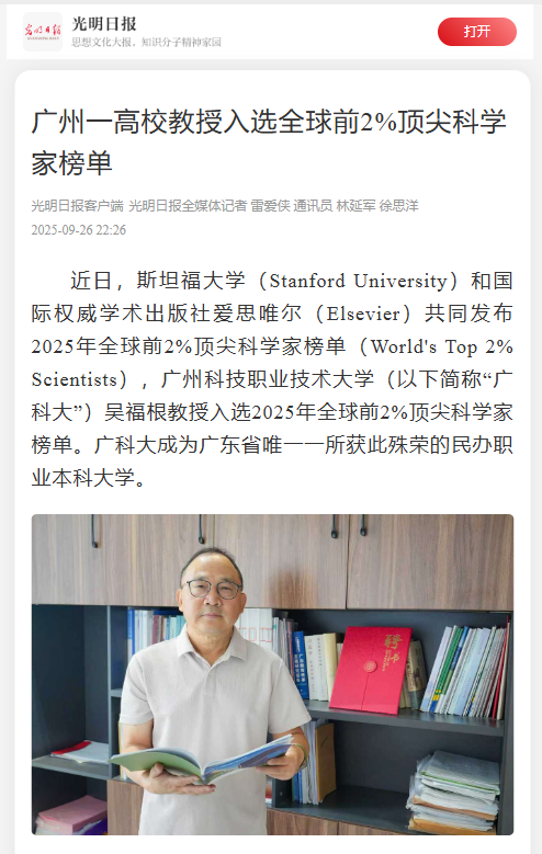 近日,斯坦福大学(Stanford University)和国际权威学术出版社爱思唯尔(Elsevier)共同发布2025年全球前2%顶尖科学家榜单(World's Top 2% Scientists),乐鱼手机平台_乐鱼(中国)(以下简称“广科大”)吴福根教授入选2025年全球前2%顶尖科学家榜单。广科大成为广东省唯一一所获此殊荣的民办职业本科大学