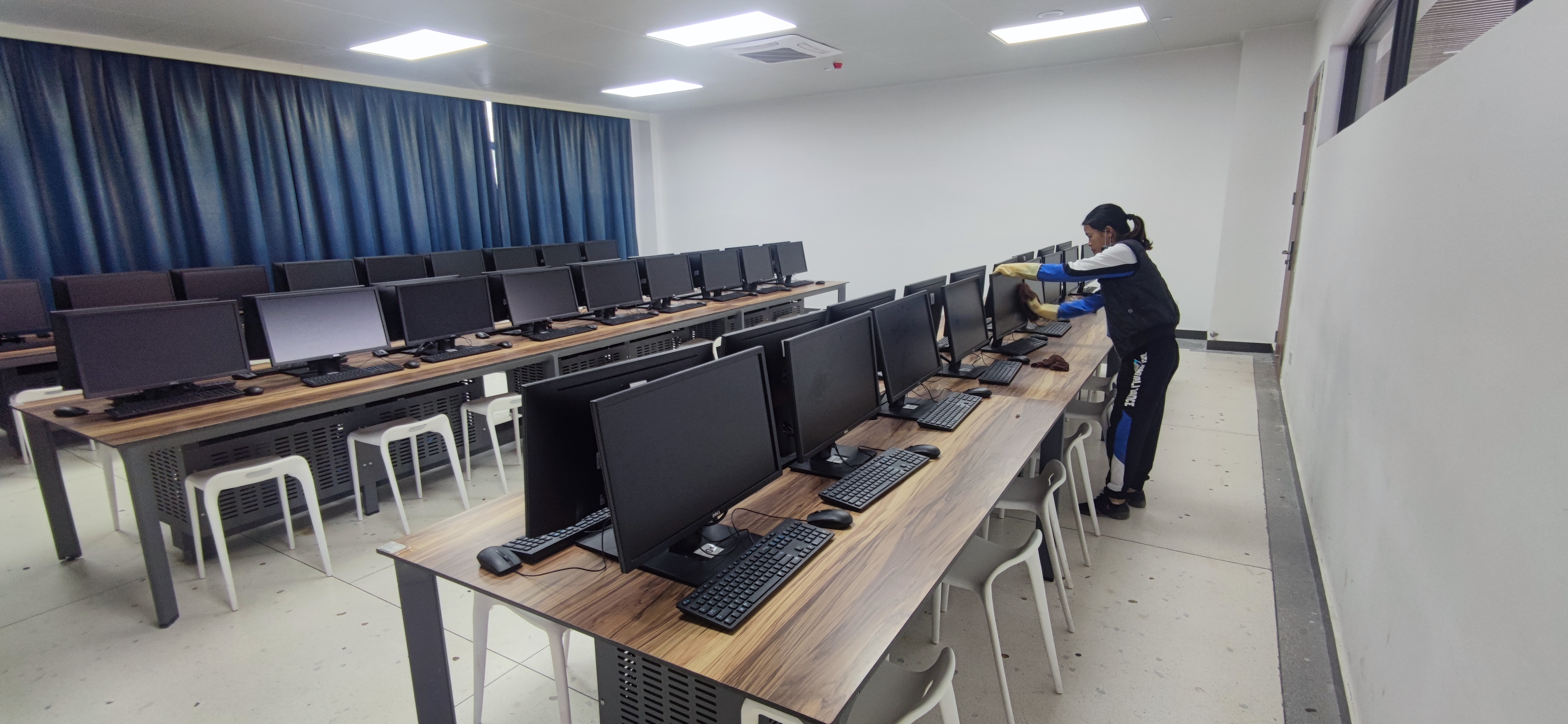 由于滨海校区的特殊地理天气条件,靠海且大风,同时扬尘严重。因此,为了给广大师生营造良好的实验(训)教学环境,滨海校区实训中心组织同学们对机房进行了全面卫生清洁工作,整理实训仪器设备。同时,联系后勤服务中心的清洁班对机房进行了清洁消毒工作。