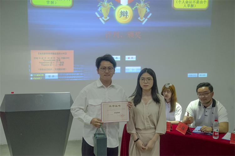 随着观众、评委及嘉宾就座,主持人黄若谷讲解比赛注意事项、比赛规则以及介绍出席评委,随后请双方辩手入座并自我介绍,比赛正式拉开帷幕!场上双方辩手的激烈交战,主持人宣布比赛结果本场最佳辩手是:反方“对怼怼队”的四辩-陈璞;广科大2021年校级辩论赛冠军是:正方“保安队”。