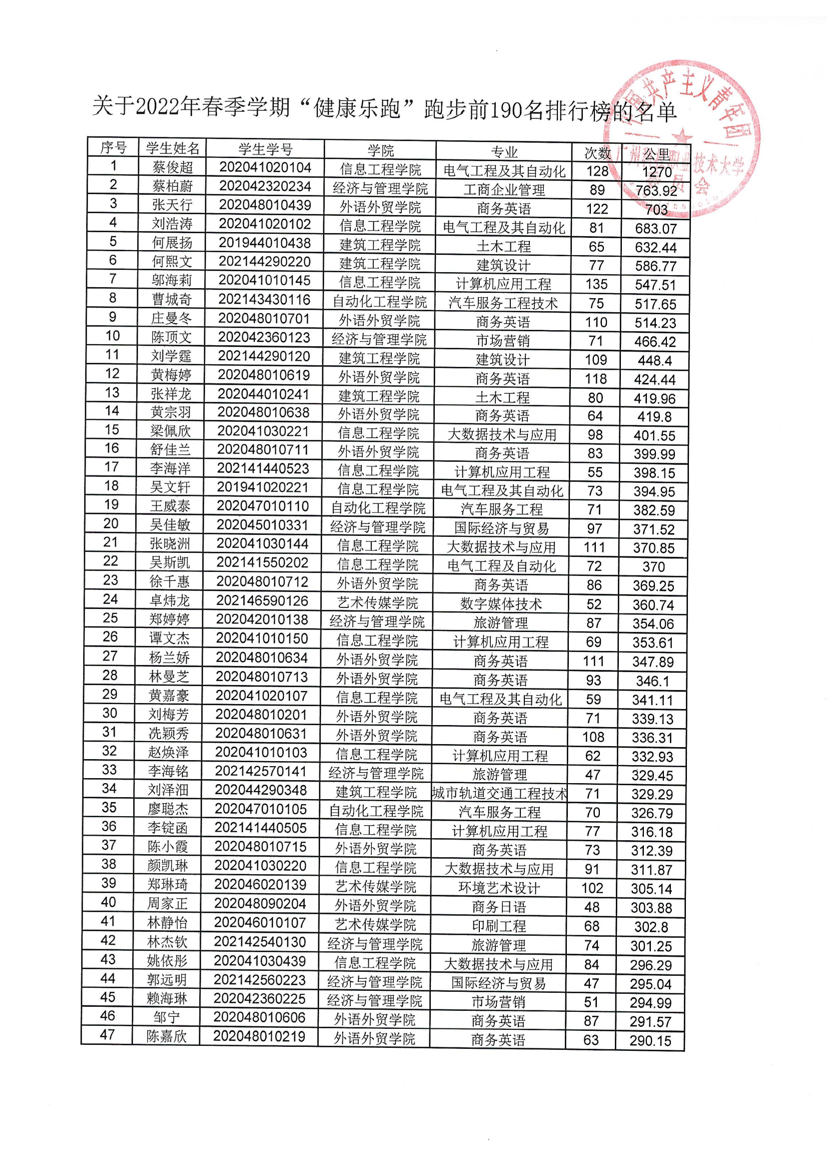 为全面贯彻落实“中共中央国务院关于加强青少年体育增强青少年体质的意见”,引导学生养成热爱体育,崇尚健康的意识,培养科学长跑、经常锻炼的习惯,全面提升全校师生的体质健康水平。根据我校《关于开展2022-2023学年春季学期“健康乐跑”活动的通知》和平台跑步数据,现将2022年春季学期“健康乐跑”跑步前190名排行榜名单公示如下: