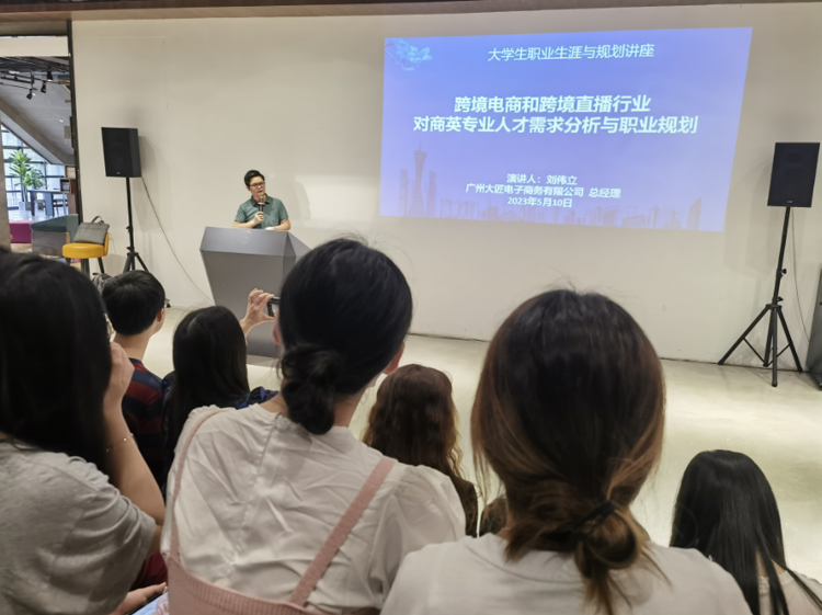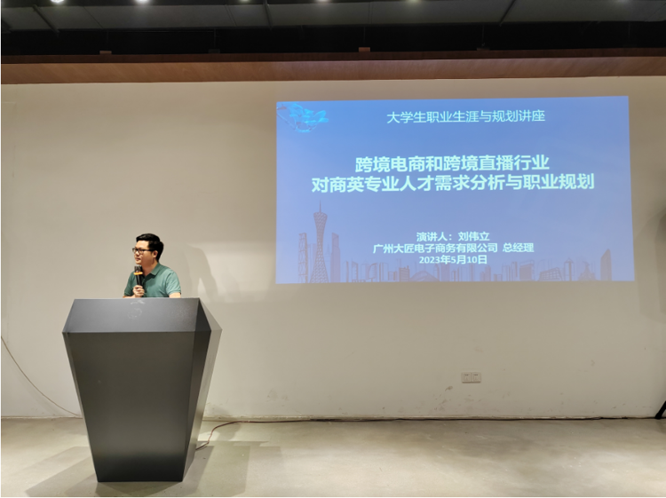 为帮助我院20级学生适应就业形势,转变就业观念,更好地进行职业生涯规划,5月10日,我院特邀广州大匠电子商务有限公司总经理刘伟立先生,于图书馆新书发布厅作“大学生职业生涯与规划”之“跨境电商和跨境直播行业对商英专业人才需求分析与职业规划”专题讲座。讲座由我院跨境电商教研室主任文浩竣主持。学院副院长杜艳红、教师宋颖出席会议。我院20级商务英语本科1至3班全体学生参加了此次讲座。