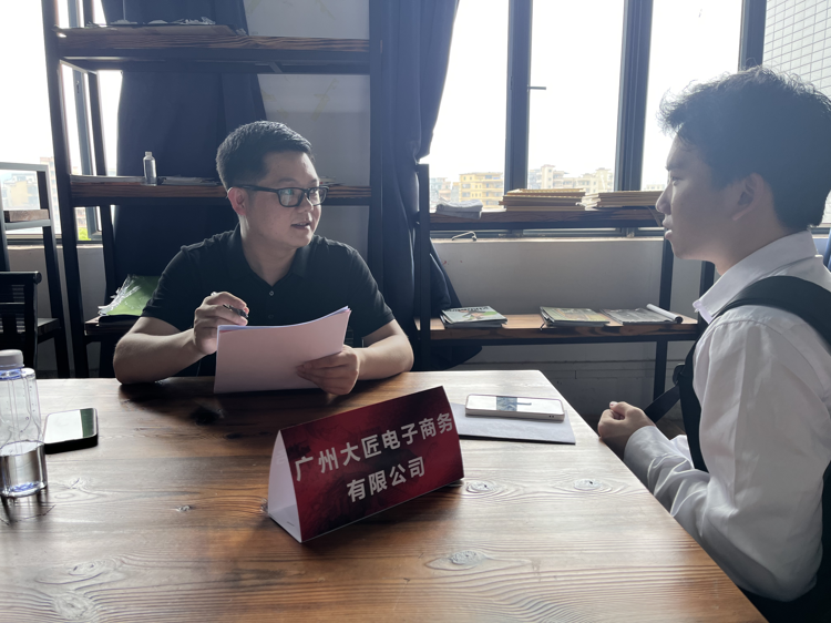 随后进入宣讲招聘环节。首先,华南电商产业科技(深圳)有限公司、佛山市瑞登帐篷有限公司、广州大匠电子商务有限公司等企业负责人依次就公司概况、发展历史、办公环境、招聘岗位、能力要求、薪酬待遇等进行宣讲,并结合自身的工作经历和职场从业经验对同学们提出的问题进行一一解答。现场气氛非常热烈。学生们积极投递精心准备的简历,并与企业负责人进行现场交流。最后有35名学生在现场与企业达成初步就业意向。