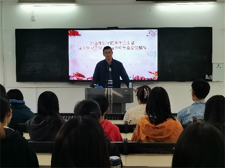 会议由学生党支部书记陈琪同志主持,外语外贸学院党总支书记刘良同志主讲。刘良书记强调,我们青年党员必须时刻学习党史和重要会议精神,精读细读总书记讲话内容,了解党的方针政策和国家动态。党的十九届六中全会全面总结党的百年奋斗重大成就和历史经验,从新民主主义革命时期、社会主义革命和建设时期、改革开放和社会主义现代化建设新时期、中国特色社会主义进入新时代四个历史时期追溯党走过的光辉历程,深刻揭示了“过去我们为什么能够成功、未来我们怎样才能继续成功”。鼓励同学们要结合实际,不断学习贯彻落实十九届六中全会精神,并在以后的学习生活中,肩负历史使命,坚定前进方向,立大志、明大德、成大才、担大任,努力做新时代的追梦人。
