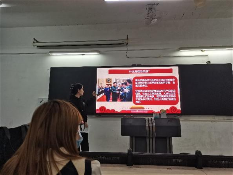 本次的主讲人是21级应用英语升本3班的罗一赟,她就“谈中国特色社会主义文化自信”这一主题发表了演讲。她从文化自信“信”什么、文化自信何以“信”、为什么我们既要克服文化自卑又要防止文化自负三个方面讲述中国特色社会主义文化自信与大学生党员文化素养之间的联系。