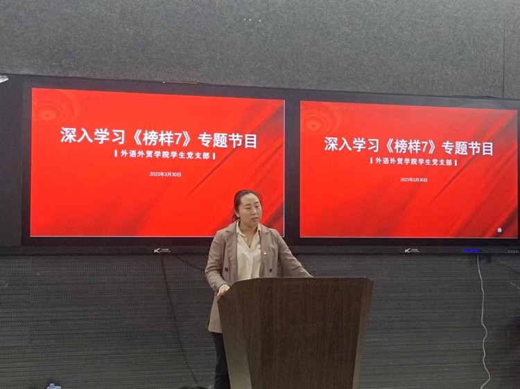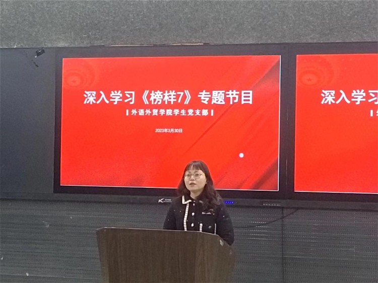 为深入学习贯彻习近平新时代中国特色社会主义思想和党的二十大精神,充分发挥先进典型示范引领作用,大力宣传党的二十大代表的先进事迹,教育引导广大党员干部学习榜样、争当先进,担当作为、建功立业,中央组织部、中央广播电视总台联合制作了《榜样7》专题节目,该节目于3月25日晚间8点档在中央电视台综合频道播出。在时间充裕的基础上,我支部于2023年3月30日晚上7点在1212教室组织在校党员集体观看,本次活动由外语外贸学院学生党支部书记陈琪同志主持。