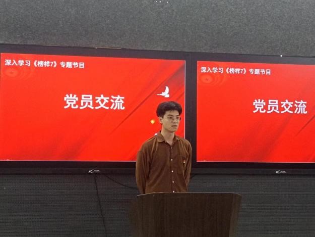 最后,支部党员同志从《榜样7》中接受洗礼,交流感悟。党员代表武越和吴洁莹发表观后感,表示将不忘初心,牢记使命,增强使命感和责任感。在今后的工作中不负时代、不负韶华,继续加强学习党的理论知识和专业知识,增加对党的认识,提高党性及专业技能。同时要紧密结合在校生身份,多为班级、学校。社会做贡献,工作带头肯干,用实际行动树立榜样。