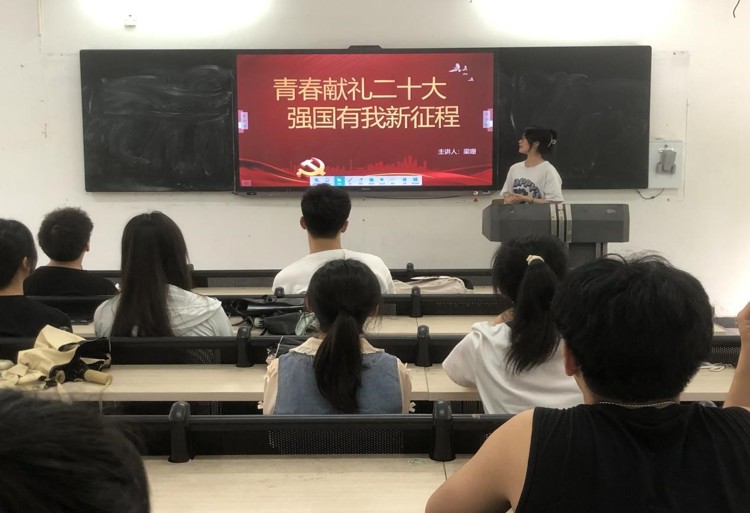 党的二十大是我们党进入全面建设社会主义现代化国家、向第二个百年奋斗目标进军新征程的重要时刻召开的一次十分重要的代表大会,是党和国家政治生活中的一件大事。梁珊同学列举了党的十九大以来中国共产党带领全国各族人民砥砺奋进五年的一些重大事件,弘扬党的二十大精神。并号召在校学生党员发挥先锋模范作用,从小事做起,为实现中华民族伟大复兴的中国梦继续奋斗,同时也祝愿中国共产党旗帜高扬迎盛世,江山千载日蒸蒸!