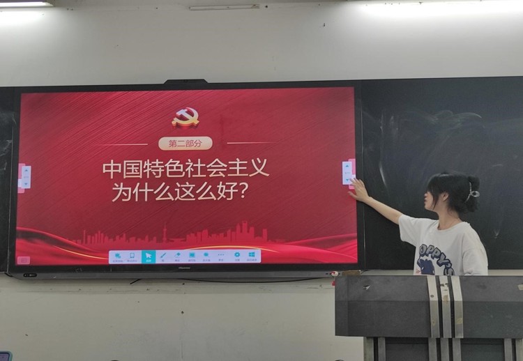 在讲解“中国特色社会主义”为什么这么好时,梁珊同学列举了抗战疫情时期中西方对比彰显出中国特色社会主义的优势。继而陈诉了中国共产党员应如何坚持中国特色社会主义。