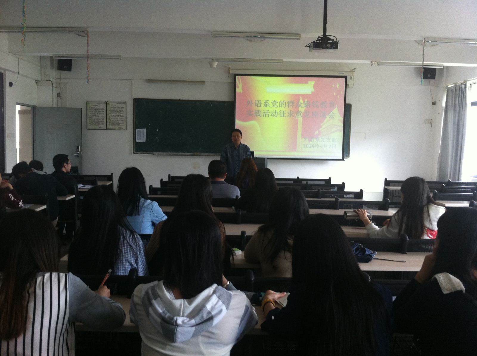 4月2日下午,外语系党支部在1203教室召开了党的群众路线教育实践活动征求意见座谈会。外语系党支部书记邱健以及党支部全体人员参加了此次会议。