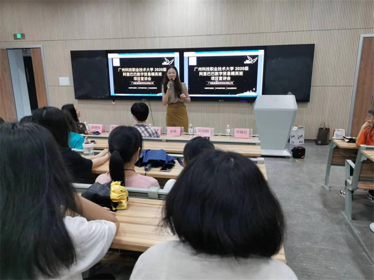 为做好2020级专科学生的实习准备工作,帮助学生树立正确的实习心态,顺利渡过从校园到职场的心理调适期,6月8日,我院成功举办2020级专科学生实习动员大会暨“阿里巴巴数字贸易精英班”项目宣讲会。外语外贸学院院长李磊、副院长杜艳红、党总支副书记刘良、教研室副主任文浩竣、付辉红以及2020级专科所有学生出席了此次会议。广州新思路教育科技有限公司总监杜晓麟、江倩雯参加了此次活动。