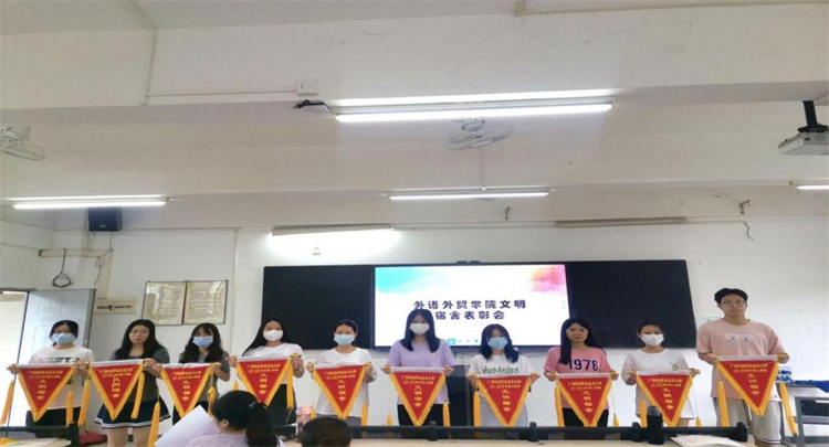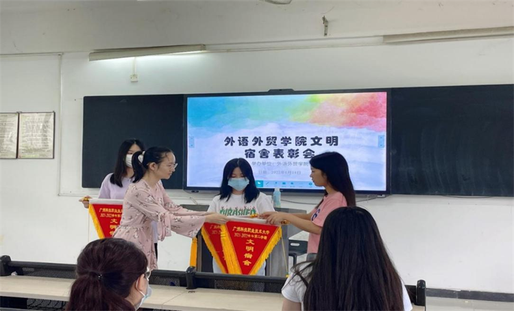 在我们所熟悉的广科大校园中,宿舍是学生生活、学习、交流的重要场所,是开展思想政治教育和培养良好校风、学风的重要教育阵地。为了给学生营造一个良好的学习、生活环境,促进学生德、智、体、美全面发展,强化学生宿舍卫生管理和激发全学院学生积极争创文明宿舍的热情,外语外贸学院于2022年6月14日在1306教室召开2021-2022学年第二学期文明宿舍系列评选表彰大会,参加大会人员有学院领导、全体辅导员、文明宿舍代表和班级代表。本次大会由外语外贸学院组织部部长连润润主持。