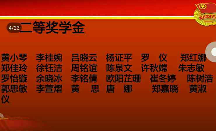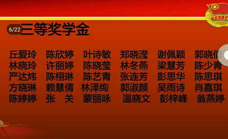 本次颁奖典礼的奖项包括:一等奖学金,二等奖学金,三等奖学金,专项奖学金,优秀三好学生,三好学生,团总支优秀学生干部,学生会优秀学生干部.