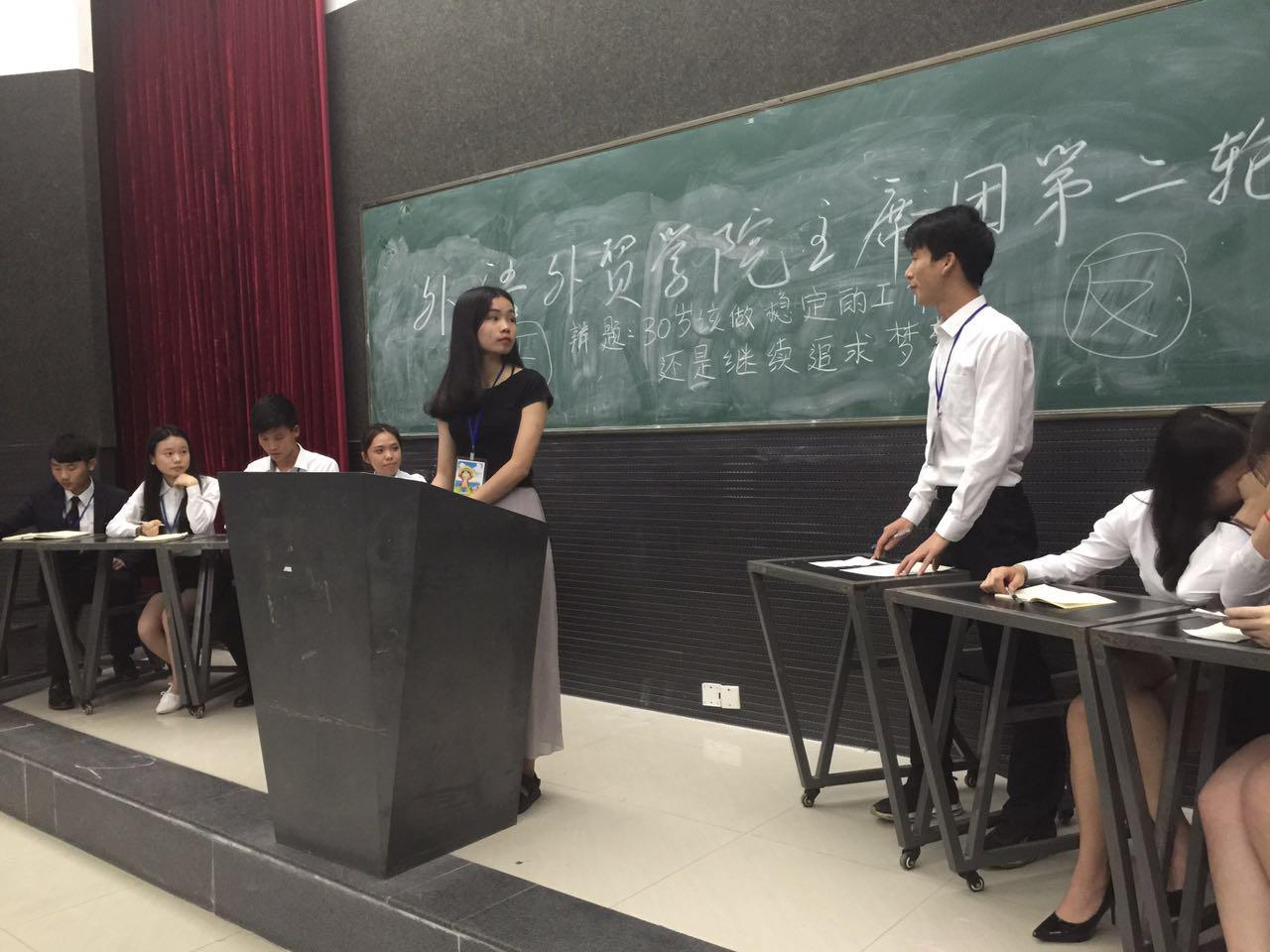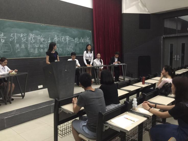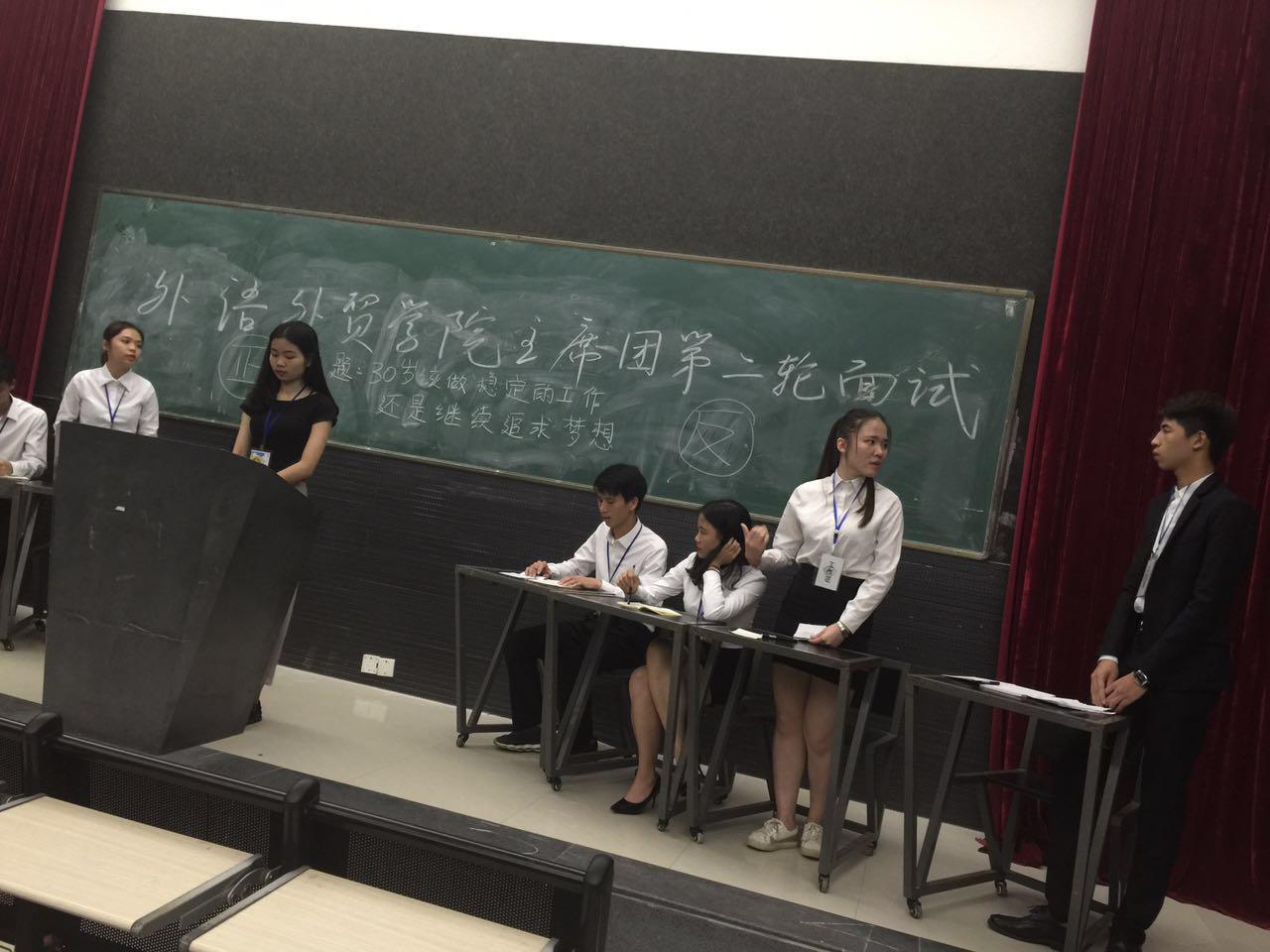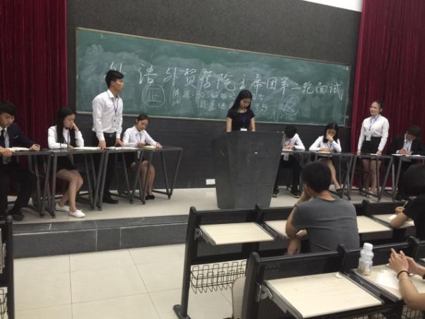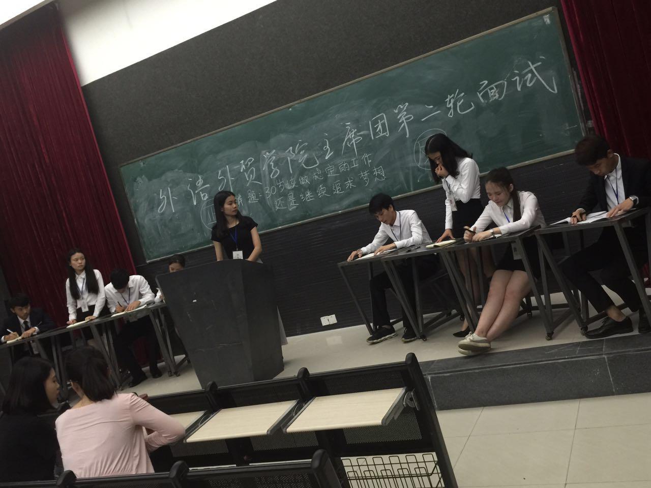 2016年5月5号晚7点外语外贸学院在阶梯一举行了学生会主席团竞选第二轮面试。竞选当晚邀请外语外贸学院团总支书记符婷婷老师,院学生会主席陈晓军,副主席梁伟麟当此次面试评委。