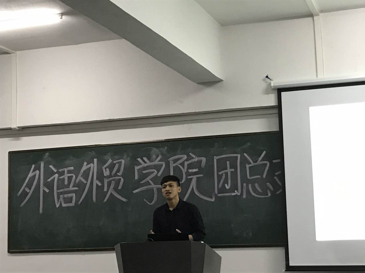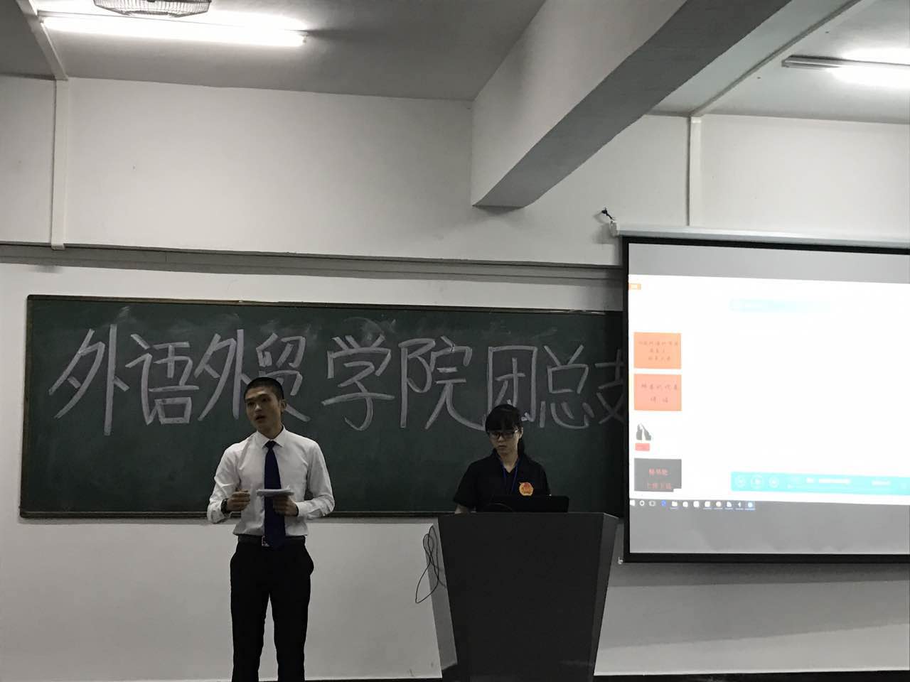 2016年10月20日晚上七点三十分,外语外贸学院团总支动员大会在3401课室召开。很荣幸邀请到党总支副书记邱健老师,管理学院团总支副书记莫宗霖、汽车工程学院团总支副书记魏宇锴、艺媒学院团总支副书记黄辉麟参加本次大会.